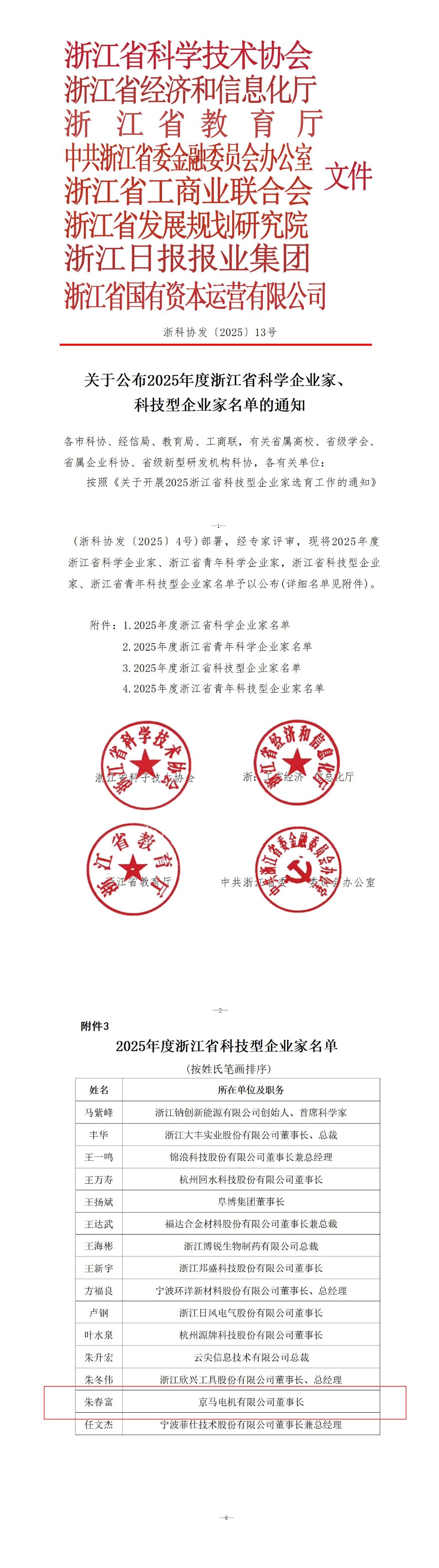 近日,由浙江省科協、省經信廳、省教育廳等聯合發起的2025年浙江省科技型企業家選育工作正式公布榜單。京馬電機有限公司董事長朱春富先生成功入選2025年浙江省科技型企業家。